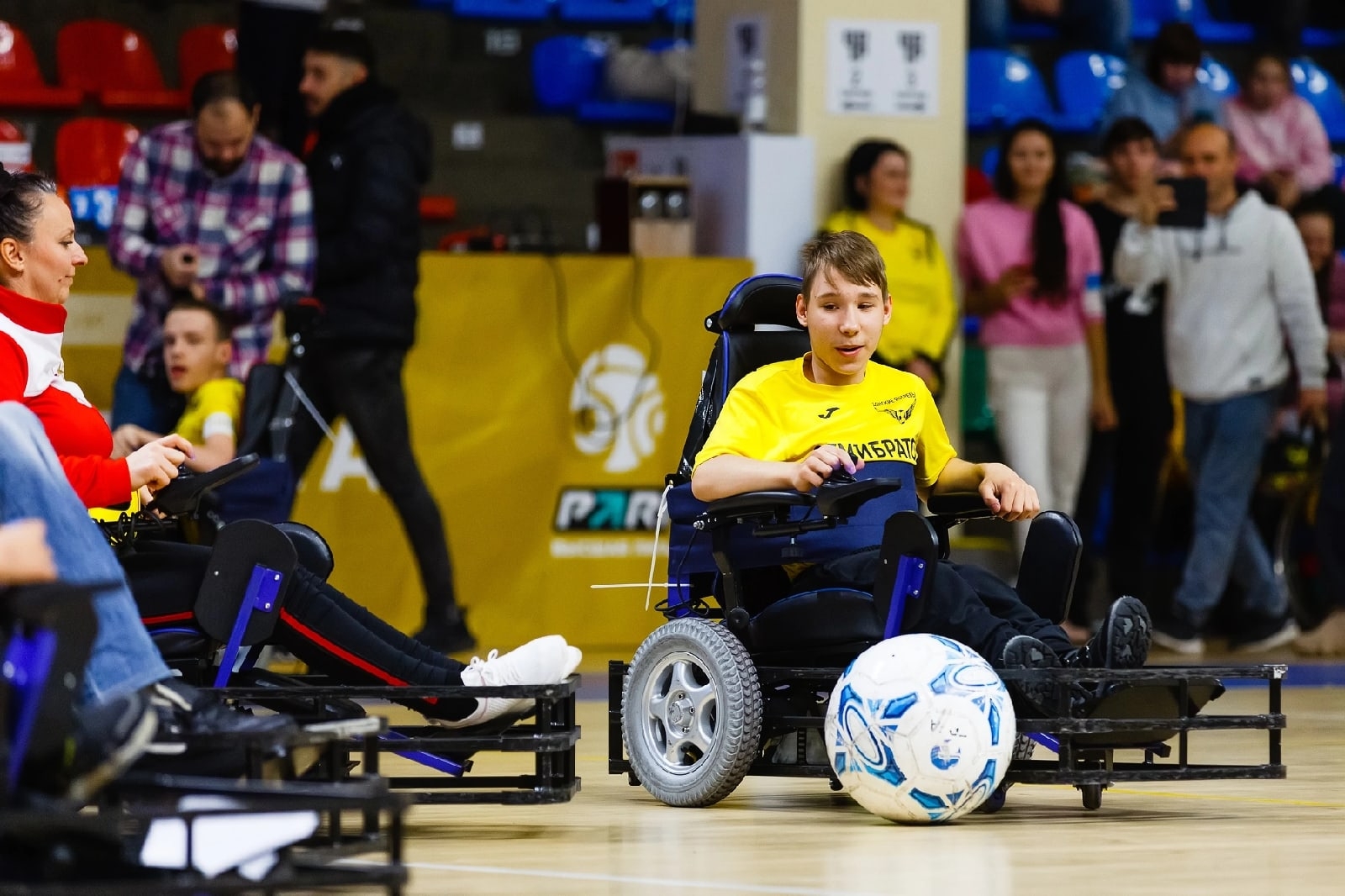 Футбол на электроколясках — командный вид спорта для людей с нарушениями опорно-двигательного аппарата, в котором игроки управляют мячом с помощью специальных колясок с защитными бамперами. Матчи проходят на площадке с воротами, а правила во многом адаптированы из классического футбола: команды стремятся забить мяч в ворота соперника, выстраивая тактику и взаимодействие. Управление коляской становится ключевым элементом игры — важны точность, манёвренность и умение быстро принимать решения. Такой формат развивает координацию, реакцию, пространственное мышление и командную работу.
